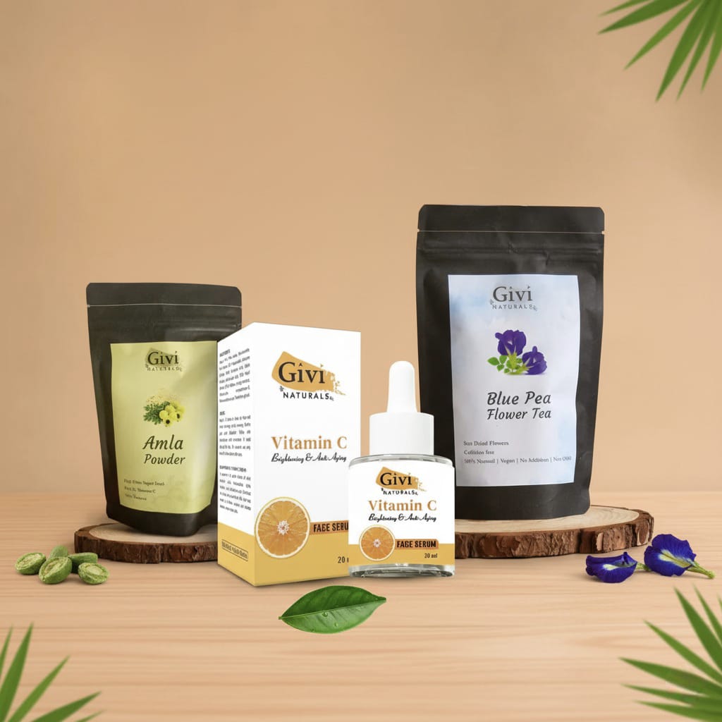Holistic Wellness: Addresses beauty and health internally with Amla and Blue Pea Tea, and externally with Vitamin C Serum.